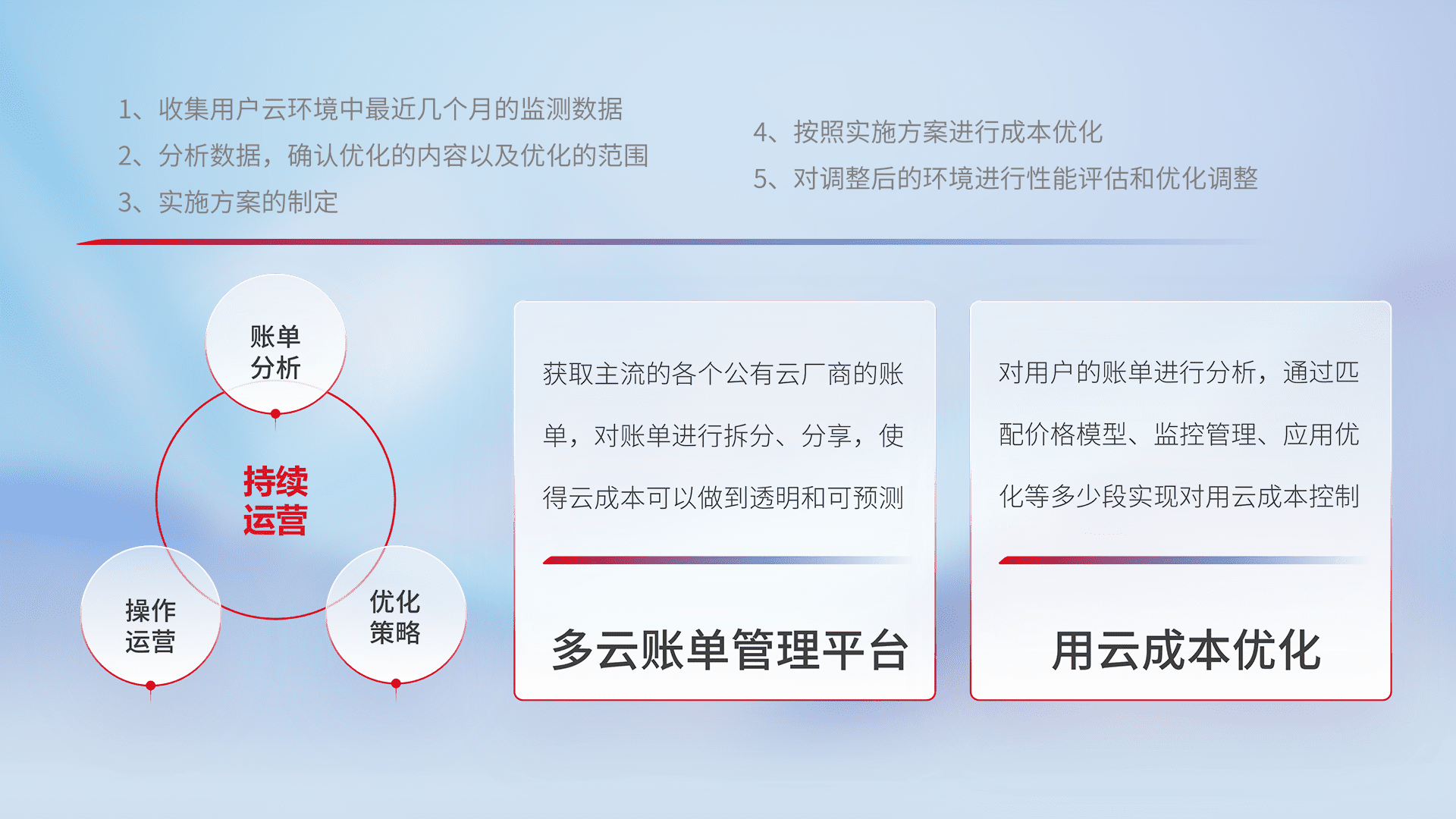 通过多云纳管,,,,以统一的资源数据模型把客户的云资源进行抽象和封装,,,,进而实现对多云资源的统一操作,,,,保障云资源管理的可靠性、、、稳定性与可用性。。。量身定制化运维内容,,,配置、、、开发运维、、、、补丁管理、、、备份、、、监控、、、、认证和访问管理、、、审计和日常巡检等,,,,保障在用云过程中的可靠度,,,稳定度以及高可用率。。。。